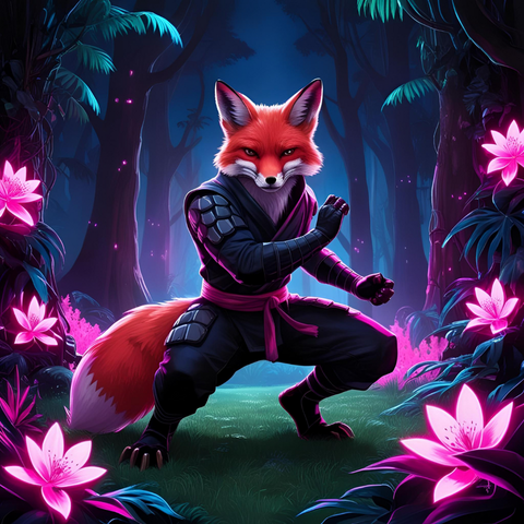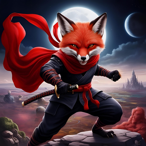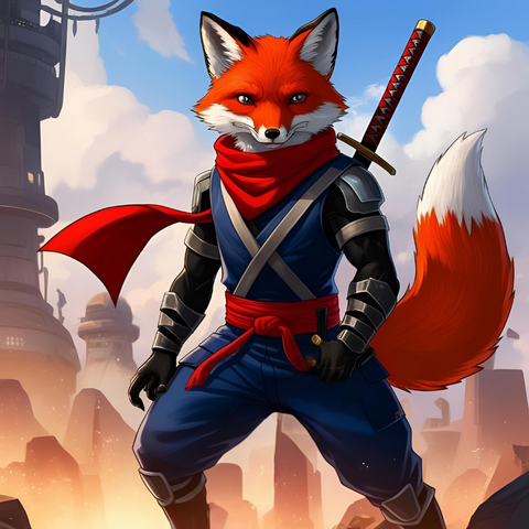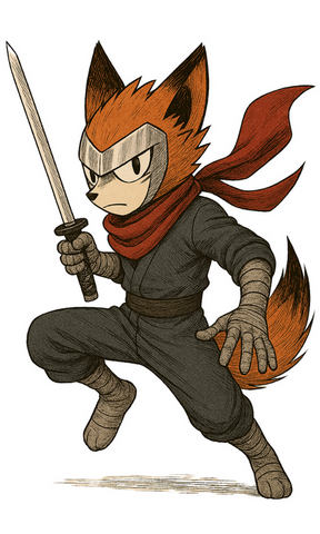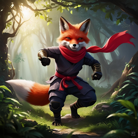 Tenue : Kimono ninja ajusté, gants de combat, bandeaux autour des pattes et une écharpe rouge vif qui ondule toujours dans le vent